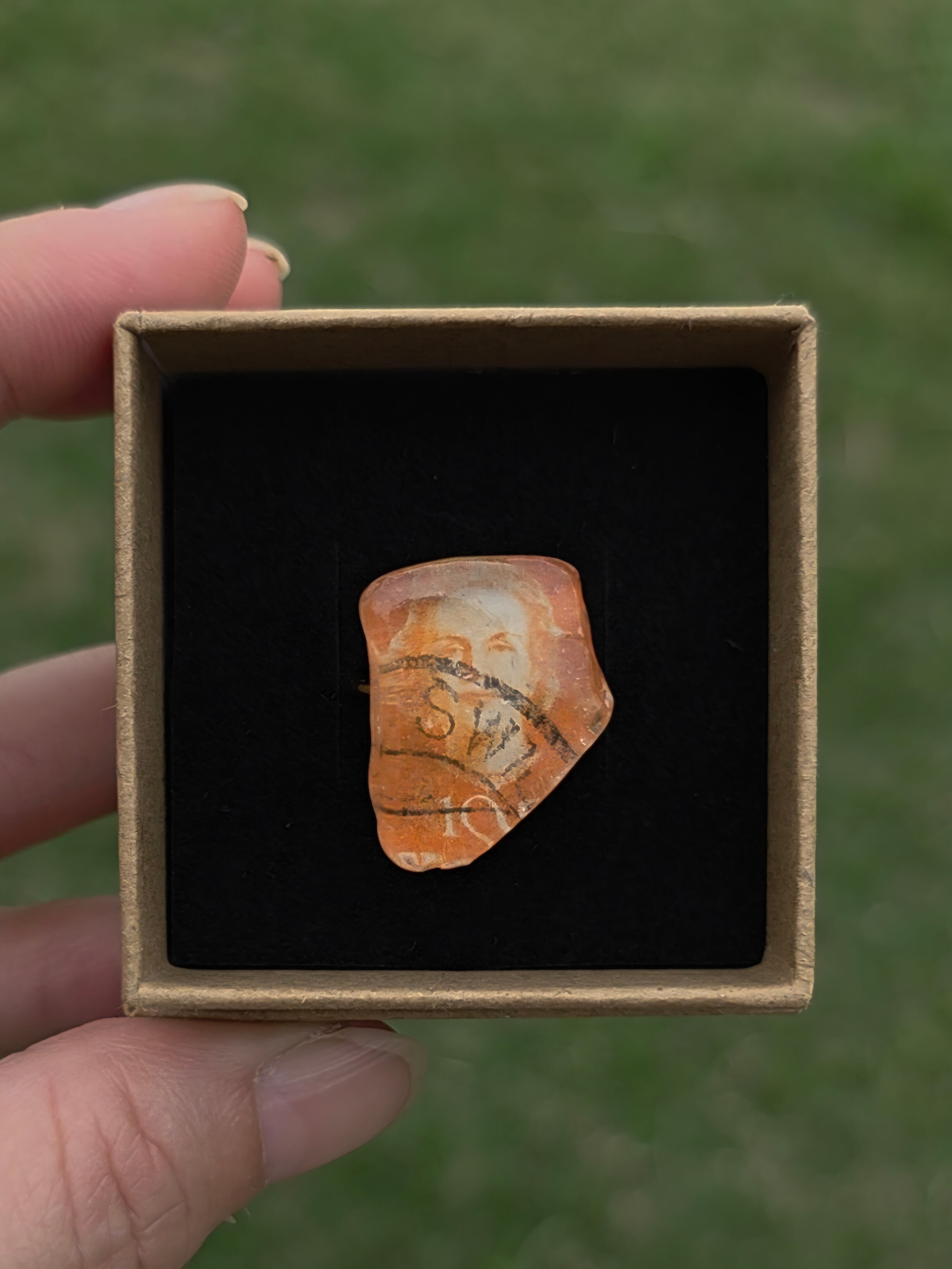 シーグラスの裏面に切手を張り付けることによって、プクッと立体感のあるデザインに仕上げました。